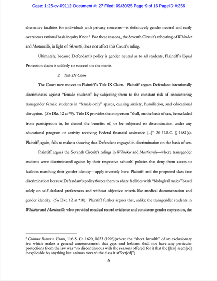 7th DISTRICT FEDERAL COURT in ILLINOIS DENIES INJUNCTION REQUEST. Obama appointed female judge Sharon Johnson Coleman sees no harm in males being permitted into female spaces alleging that the female student's distress is "suspect".