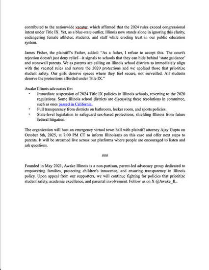 An emergency town hall will be streamed live on Monday October 6, 2025 at 7pm CDT across Awake Illinois' platforms (X, Facebook, and YouTube) where Attorney Ajay Gupta will break down the merits of the injunction request and next steps for Illinois parents. Join us and ask questions.