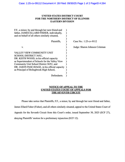 against the Illinois State Board of Education (ISBE) and Valley View School District 365U (VVSD), alleging violations of Title IX for recommending and enacting policies that permit males into female bathrooms and private spaces at K-12 schools.